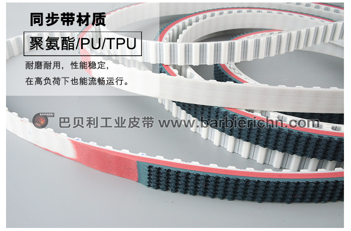 巴贝利 聚氨酯同步带,采用热塑性聚氨酯制造,独特的钢芯处理,耐磨耐用,性能稳定,在高负荷下也能流畅运行。